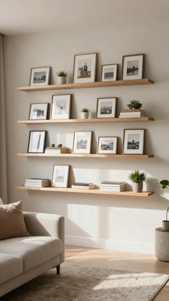 For a functional yet stylish approach, consider installing slim floating shelves to display your favorite pictures alongside decorative items. Floating shelves add dimension to your walls and are perfect for those who enjoy regularly updating their displays. Mixing framed pictures with books or plants can create a curated and inviting atmosphere.