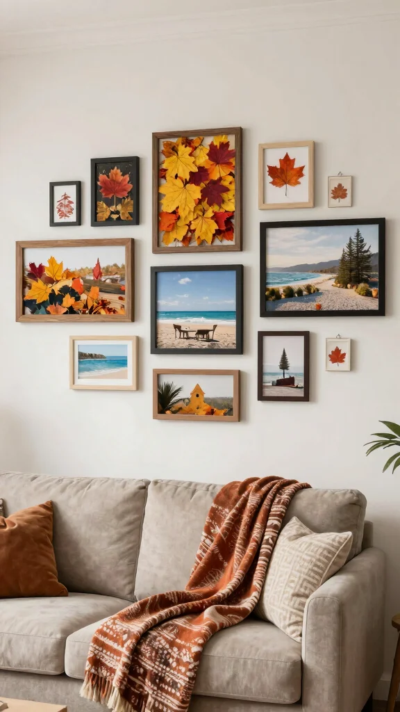 To easily switch things up, consider using removable frames that allow for quick seasonal swaps. Adding seasonal decor elements, like small wreaths or garlands, around your pictures can enhance the theme and create a festive atmosphere. Establishing a cohesive theme for each season that complements your existing decor will bring everything together beautifully.