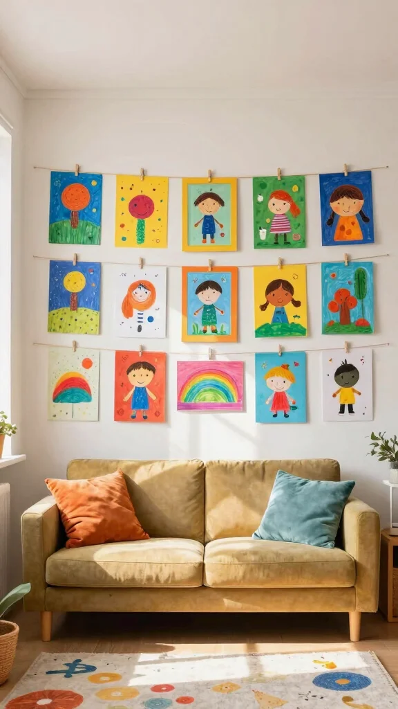 To create this cheerful display, choose a specific area, such as a hallway or a section of your living room, where their artwork can be prominently featured. Using washi tape or strings with clothespins provides an informal yet charming way to hang their creations, allowing for effortless updates. Involve your kids in the arrangement process to make it a fun family activity.