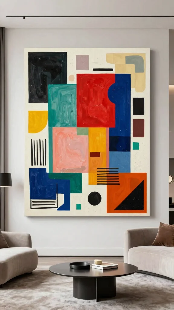 A modern art-inspired wall featuring a blend of abstract pieces and geometric prints can infuse energy and vibrancy into your living room. This contemporary style thrives on bold colors and interesting forms, creating a dynamic visual experience. Seek out a variety of prints that share complementary colors and diverse textures to form an engaging arrangement.