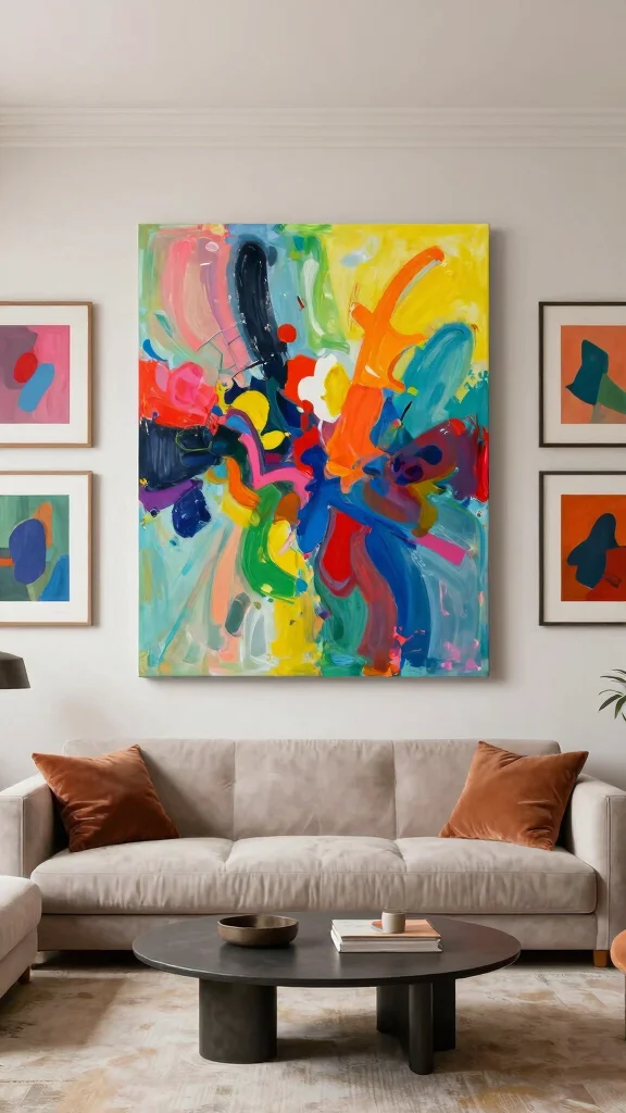 To achieve this look, group artworks that share a color palette while differing in style for a cohesive yet eclectic feel. Including a large statement piece as the centerpiece can draw attention, while smaller works around it maintain balance. Ensure there is sufficient space between pieces to let each one breathe and shine.