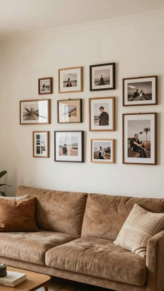 To bring this concept to life, consider selecting a neutral wall color that allows your images to stand out. You can also incorporate a variety of frame styles, such as vintage wood or modern metal, to create an artistic flair. Adding small wall-mounted shelves between frames can offer a spot for plants or decorative items, making the display even more dynamic.