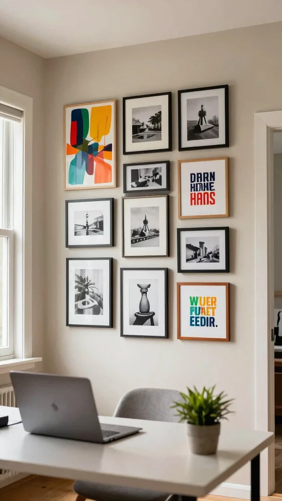 To implement this idea, select a cohesive color palette that complements your workspace and consider mixing frame styles for added depth. You can even find budget-friendly art prints online or create your own pieces to personalize the space further.