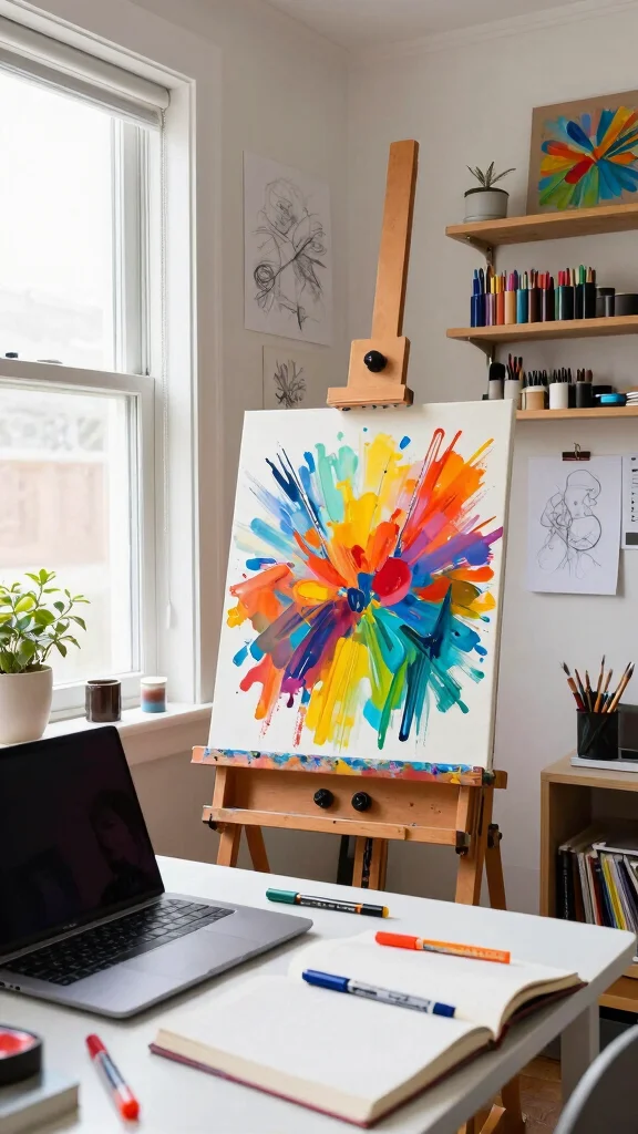 To achieve this creative studio vibe, arrange your materials in an organized yet visually appealing manner. Shelves filled with your craft projects can further infuse creativity into your workspace.
