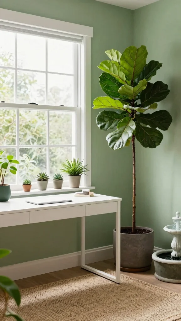 Fun fact: greenery can increase focus by up to 15% in a home office. For home office background ideas, mix in low-light plants and a bold fiddle leaf fig to create a calm, camera-ready backdrop.