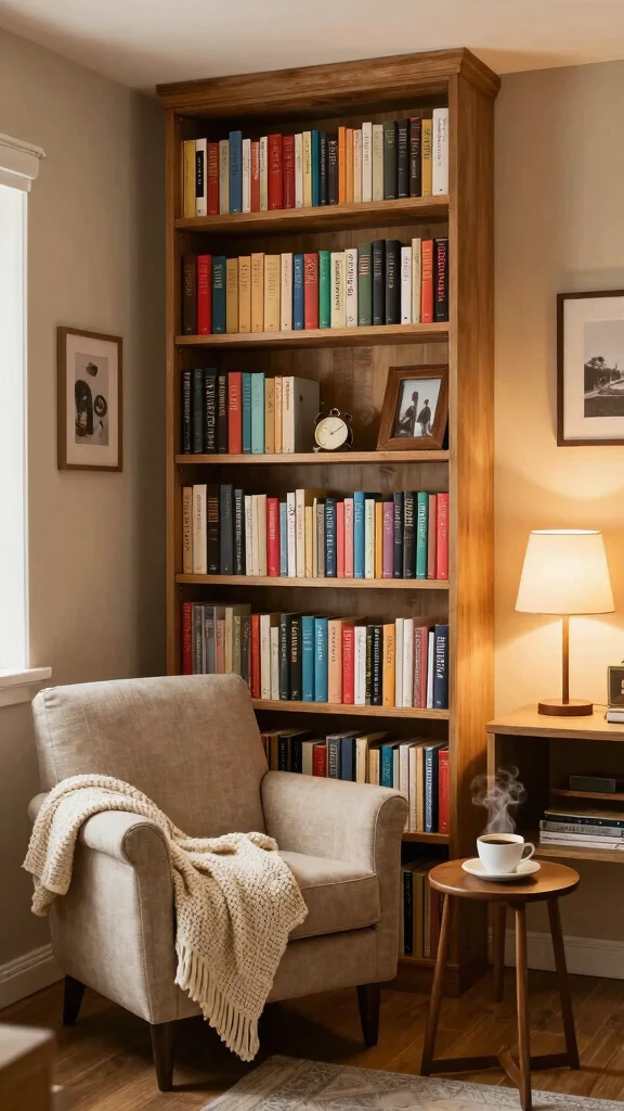 To enhance this setup, consider arranging books by color or theme and adding personal touches like small sculptures or framed photos. A cozy reading chair can also elevate the space while providing a comfortable spot for breaks.