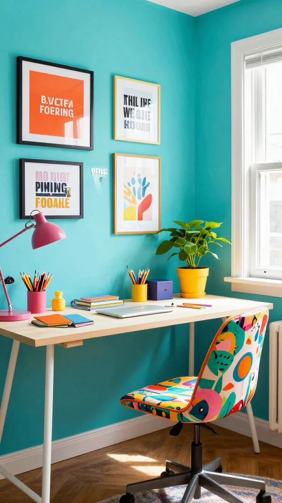 To implement this idea, choose paint colors or wallpaper that resonate with your style and consider incorporating bright office supplies that enhance the overall look. You can also find inexpensive artwork that features cheerful colors to complete the scene.