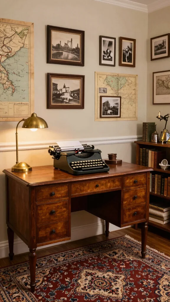 To create this look, search for antique stores or flea markets to find one-of-a-kind pieces that resonate with you. Incorporating cozy textiles like a vintage rug can also enhance the inviting ambiance of your office.