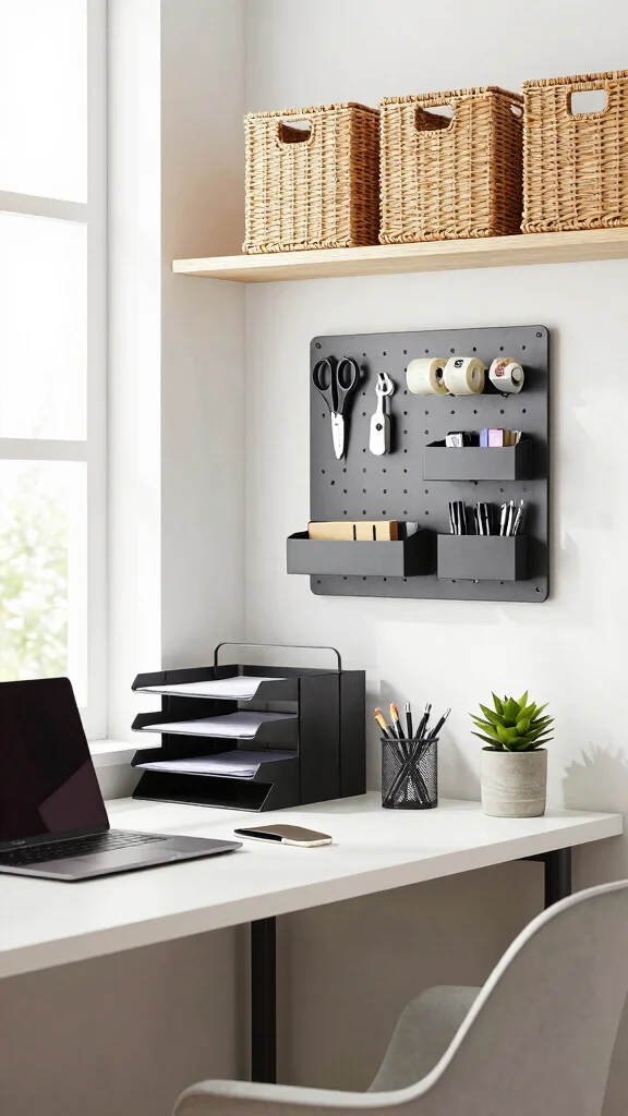 To achieve this, opt for chic organizers or woven baskets that fit your decor style, and consider using cable management solutions to hide unsightly cords. Adding a wall-mounted pegboard can also provide easy access to items while keeping everything organized.
