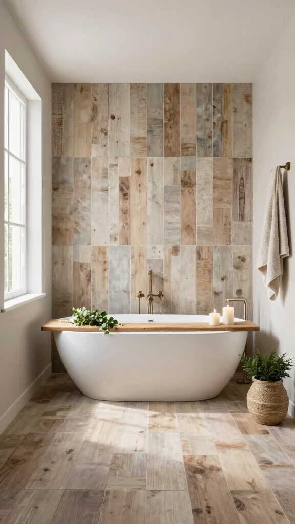 Reclaimed wood-look tiles combine rustic charm with modern practicality, offering the appearance of real wood without the upkeep. This design choice brings warmth and a sense of nature into your bathroom, creating a cozy retreat. Choose rich mahogany tones or soft ash hues to achieve a beautiful contrast with sleek fixtures or vintage accents, making the space feel inviting and stylish.