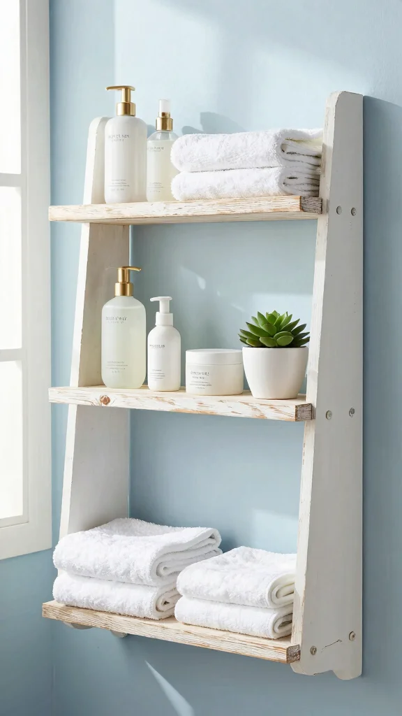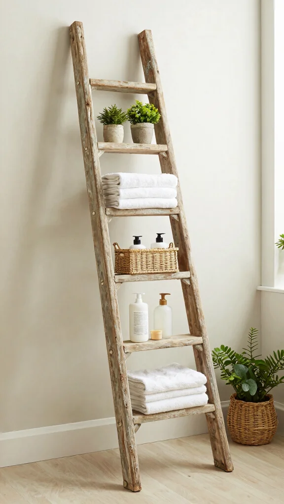 This rustic design works beautifully in farmhouse-style bathrooms, complemented by soft textiles and natural materials. You could paint the ladder in a delightful pastel hue for a splash of color or leave it in its original state for a vintage appeal.