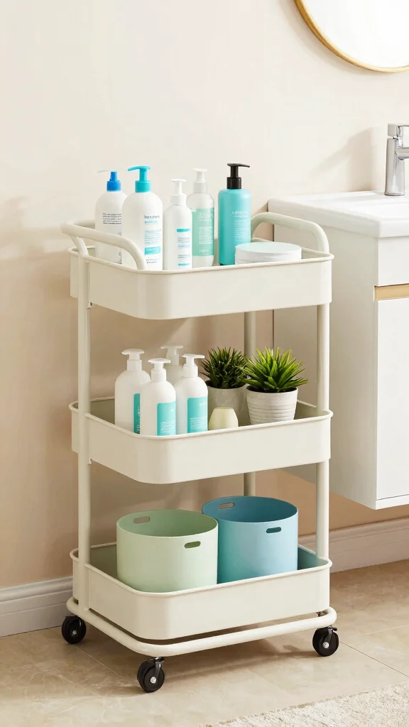 “Moveable storage is a game changer for small baths: a multi-tiered cart keeps every bottle within reach without clutter. Use eco-friendly materials and decorative bins to turn it into a chic bathroom organizer shelf you actually love to display.”