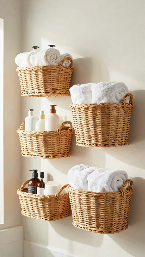 Mount them at varying heights to create a unique display that mixes functionality with artistic flair. Use these baskets for everything from towels to toiletries, ensuring your essentials are always within reach.