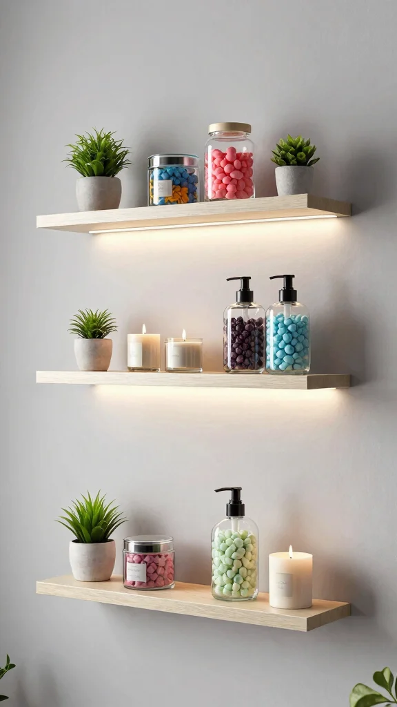 The versatility of floating shelves allows you to arrange them in a straight line for uniformity or stagger them for an eclectic look. Opt for colorful containers to add a cheerful touch or clear glass for a sleek, sophisticated appearance.