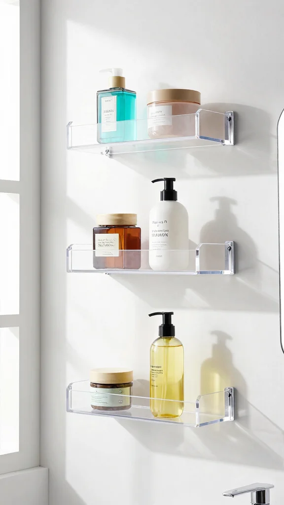 Fun fact: Clear acrylic shelves add a 25% boost to perceived space, perfect for smaller bathrooms. They’re lightweight and easy to install, turning any bathroom organizer shelf into a clean, modern focal point. Let your decor shine through!