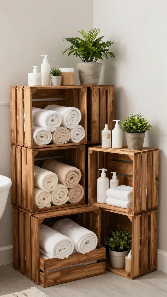 Get creative by arranging the crates in a unique layout and filling them with towels, toiletries, or decorative items like candles and plants. This approach keeps everything tidy while creating a visually appealing display that reflects your personality.