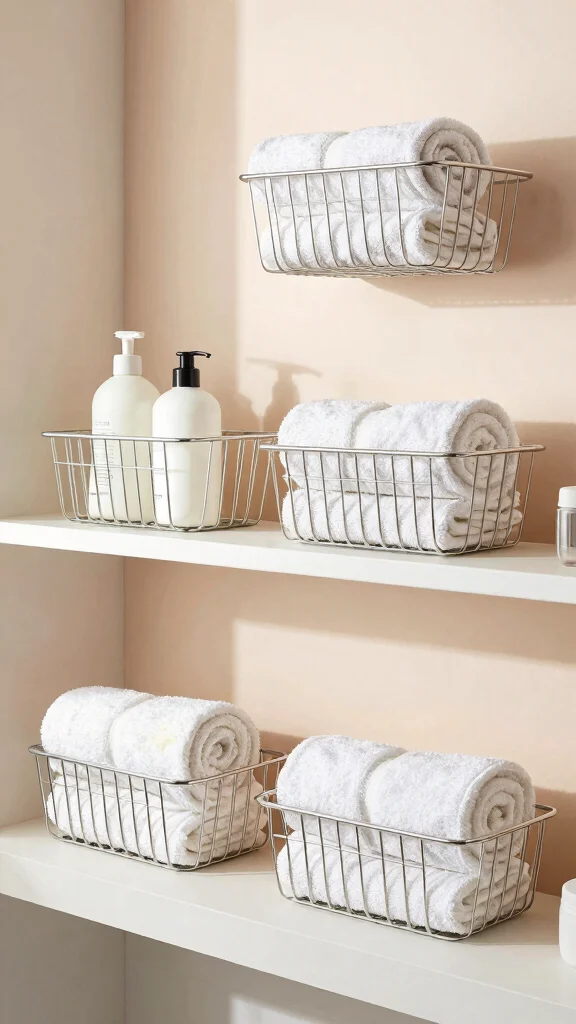 Metal wire baskets are a trendy and functional addition to any bathroom organizer shelf. They introduce a rustic yet modern texture, enhancing visual interest without being bulky. These baskets are perfect for storing rolled towels or products while keeping your essentials visible and stylish.
