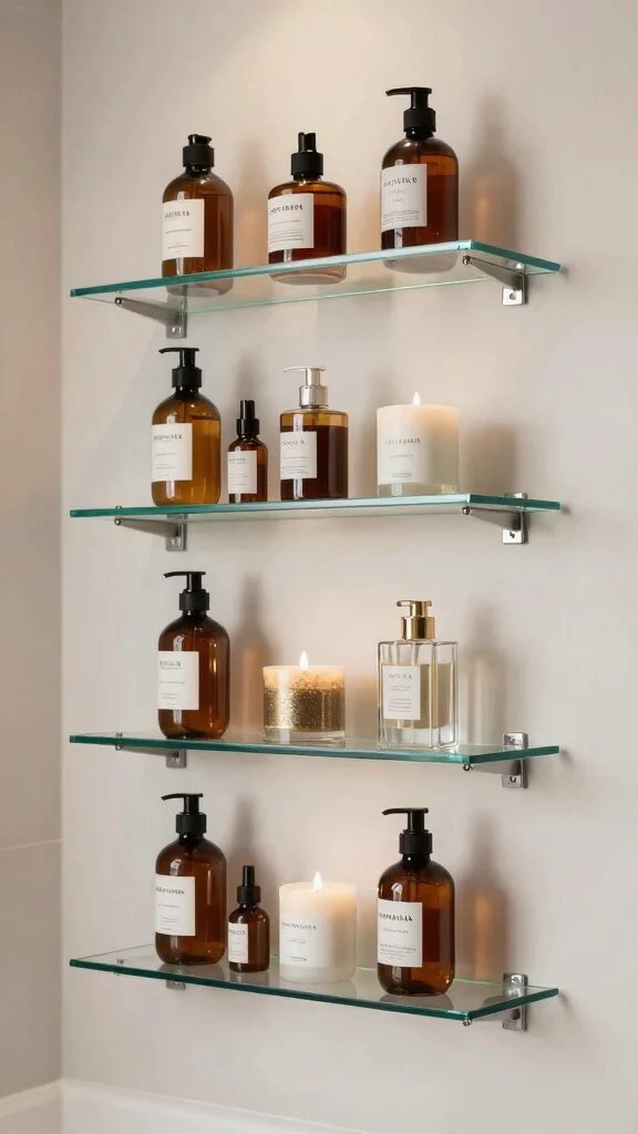 For an elegant touch, consider sleek glass shelves in your bathroom. These minimalist shelves elevate your space, providing a clean and modern look that complements any decor style. Glass is easy to maintain and pairs beautifully with eco-friendly metal brackets for added support.