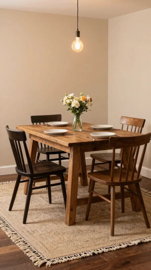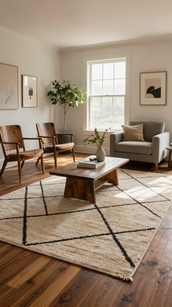 To implement this look, consider pairing a geometric rug with vintage furniture to create a charming contrast. You can find budget-friendly options at local thrift stores or online marketplaces. The combination of contemporary design with rustic elements resonates with current trends and brings a cozy atmosphere to your home.