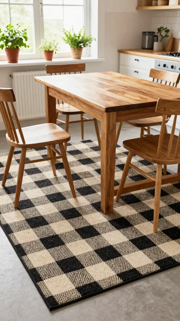 Checkered patterns bring a classic and timeless charm to modern interiors. A beige and black checkered rug serves as a fantastic foundation piece, effortlessly complementing various decor styles. Imagine a cozy kitchen where a checkered rug creates a structured yet inviting environment, enhancing the overall aesthetic. This versatile design works beautifully in dining areas or living rooms, providing both comfort and style.