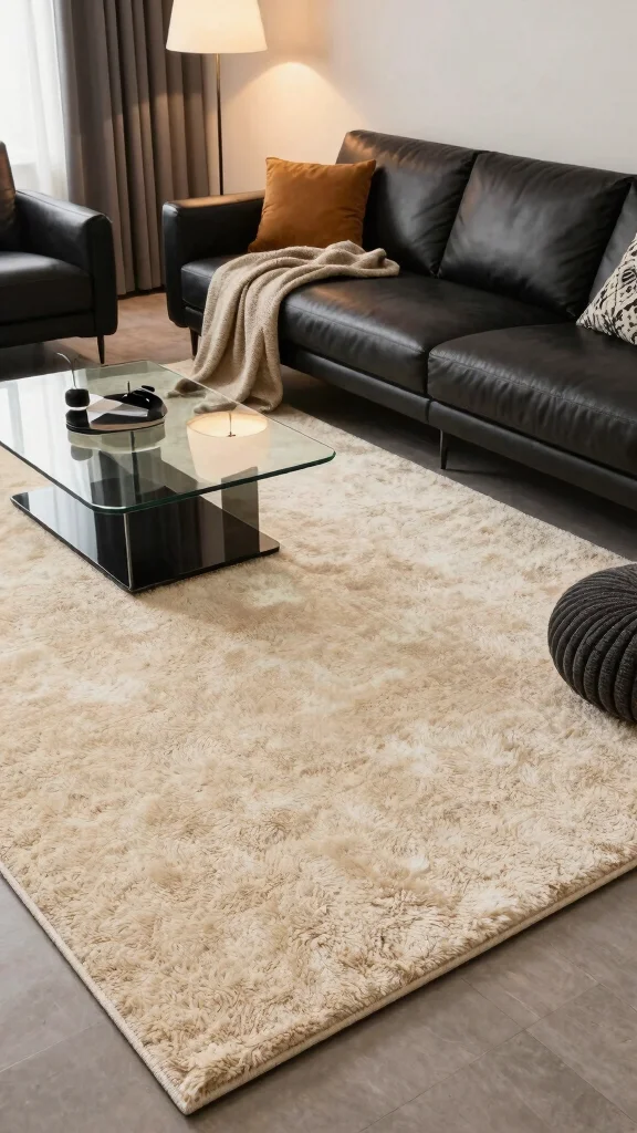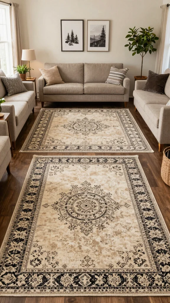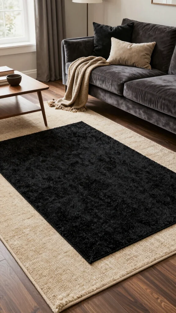 Layering rugs adds depth and personality to your space, creating a unique and inviting atmosphere. Start with a larger neutral rug in beige and position a smaller black area rug on top for a striking contrast. This technique allows you to creatively mix patterns and textures, reflecting your personal style while enhancing the overall design of the room.