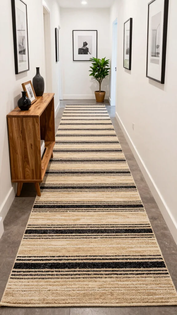 Classic stripes in beige and black are a timeless choice that brings elegance and a sense of space to any room. The clean lines create the illusion of expansiveness, making your home feel more open and inviting. Picture a chic rug with horizontal stripes that stretches across a narrow hallway, or vertical stripes that elevate the ceilings in a cozy living area. This versatile design complements modern aesthetics while adding depth to your decor.