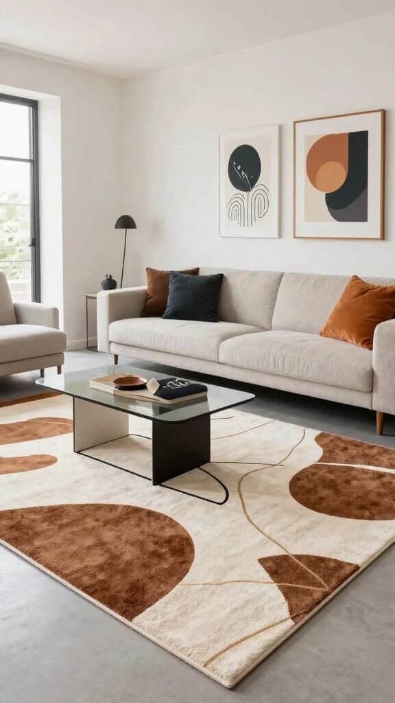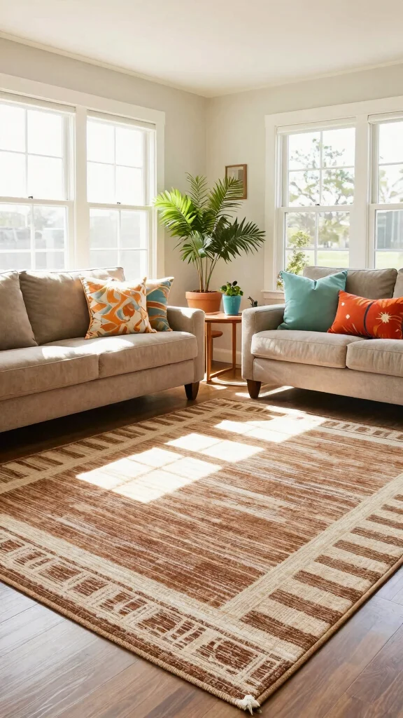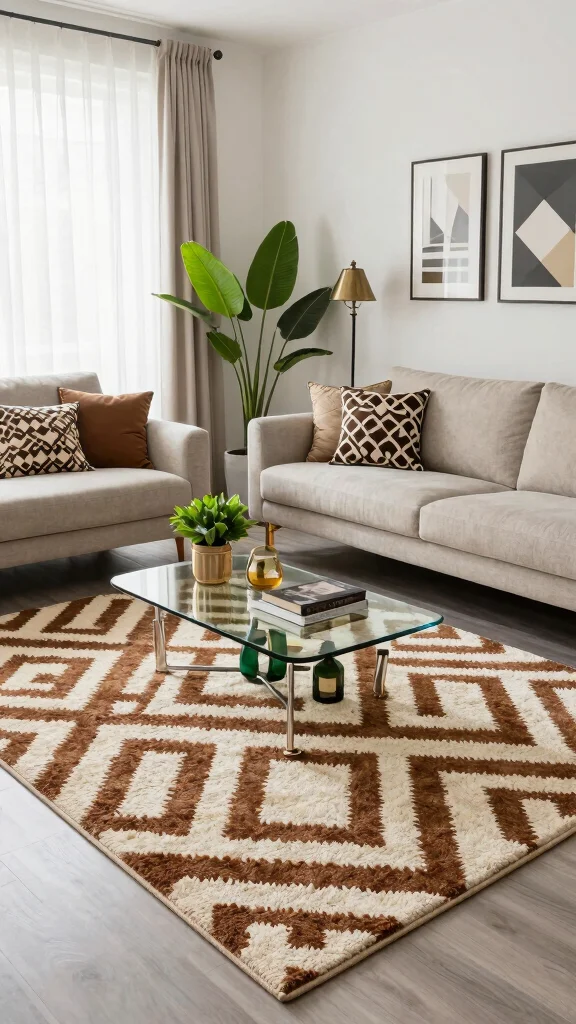 Choose a graphic area rug in brown and cream for a bold statement piece that transforms your living room. These rugs often feature eye-catching designs that add a modern twist to traditional decor. Imagine how a striking graphic rug can serve as a focal point, enhancing your room’s character while keeping surrounding furnishings simple.