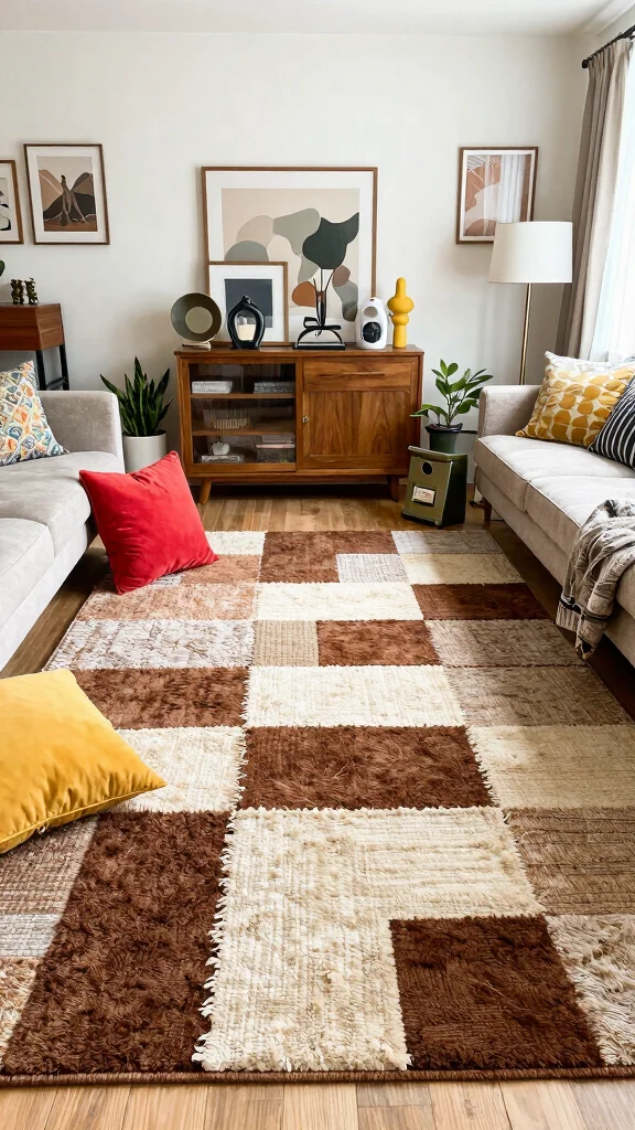 Embrace creativity with a patchwork area rug that combines various fabrics and textures in shades of brown and cream. These rugs celebrate individuality and can serve as a stunning centerpiece in your living room. Picture how a patchwork rug can add a vibrant touch while being perfect for layering with eclectic decor.