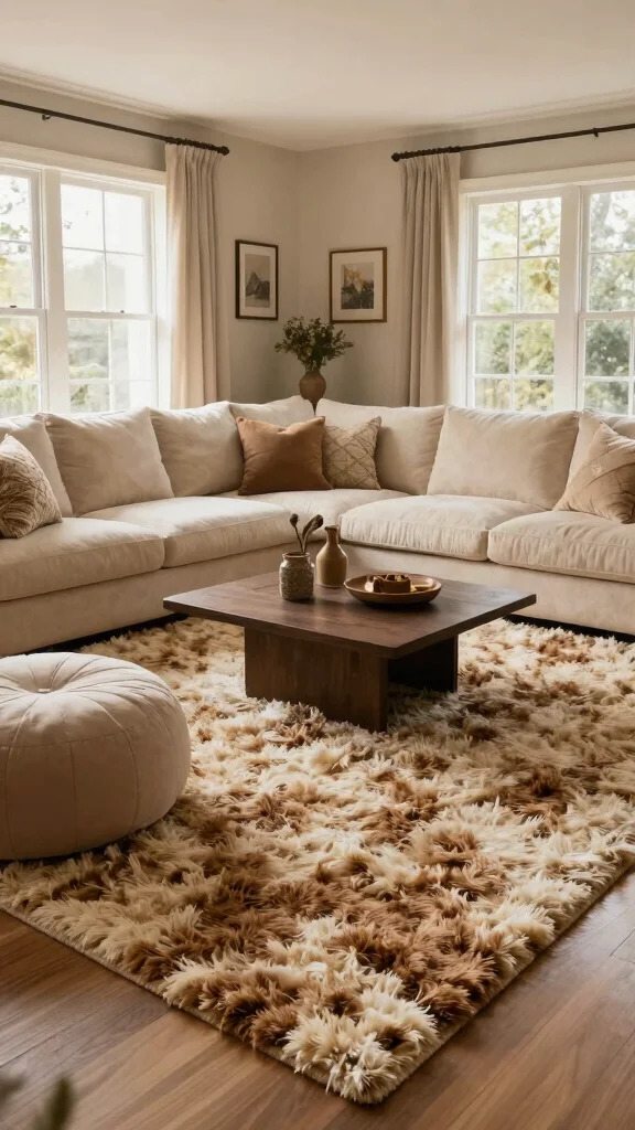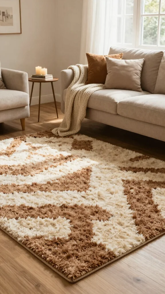 For a lavish touch, a soft, shaggy area rug in brown and cream can create a warm and inviting feel in your living room. These rugs are designed for comfort, making them ideal for spaces where you relax and unwind. Imagine sinking your toes into a plush rug in front of a cozy sofa or under a low coffee table for a luxurious experience.