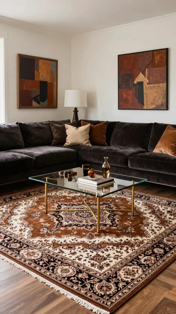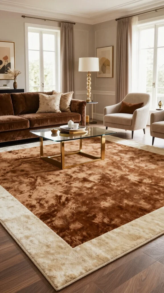 Lastly, consider a luxurious velvet area rug in rich brown and cream tones to add an opulent touch to your living room. Velvet rugs not only bring sophistication but also keep the space feeling cozy and inviting. Picture this rug elevating a formal setting or a space designed for entertaining guests, creating a lush backdrop for gatherings.