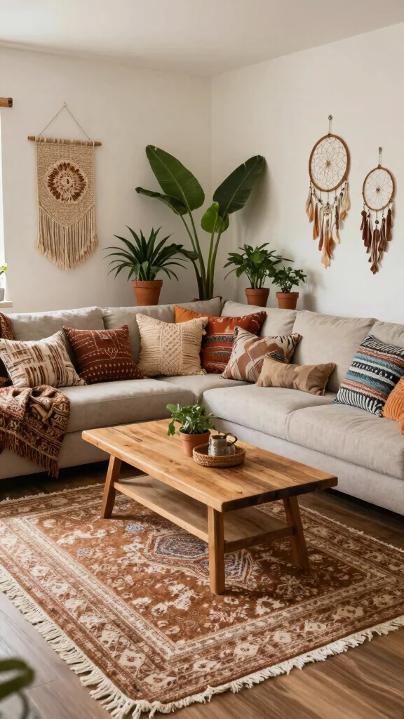 To enhance the bohemian feel, incorporate rustic wooden furniture and large plants. This combination fosters a warm, inviting environment that feels effortlessly chic.