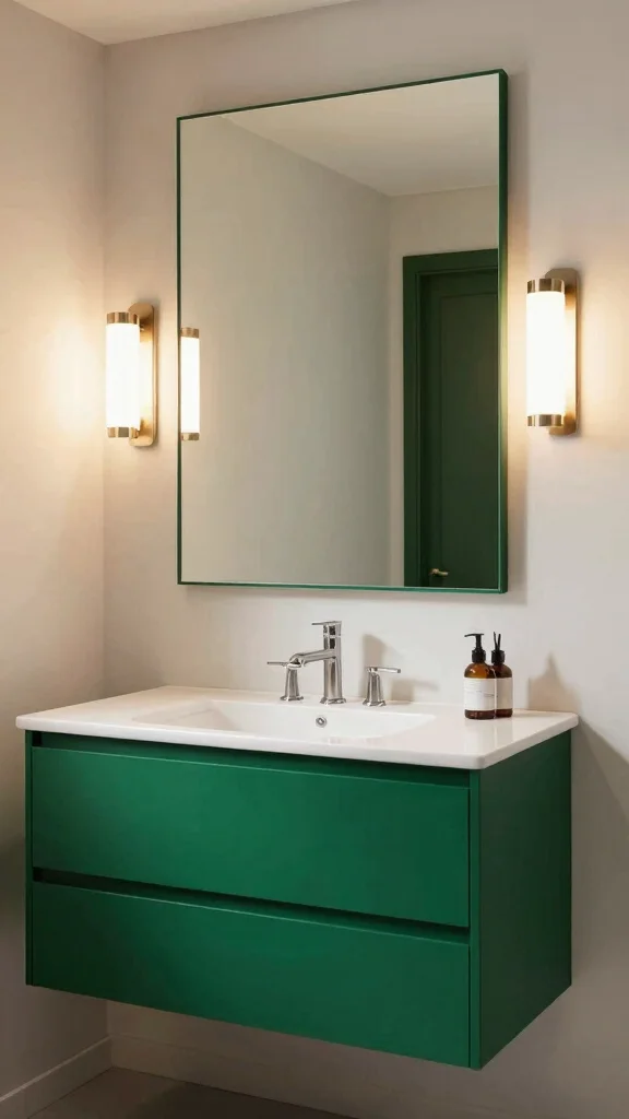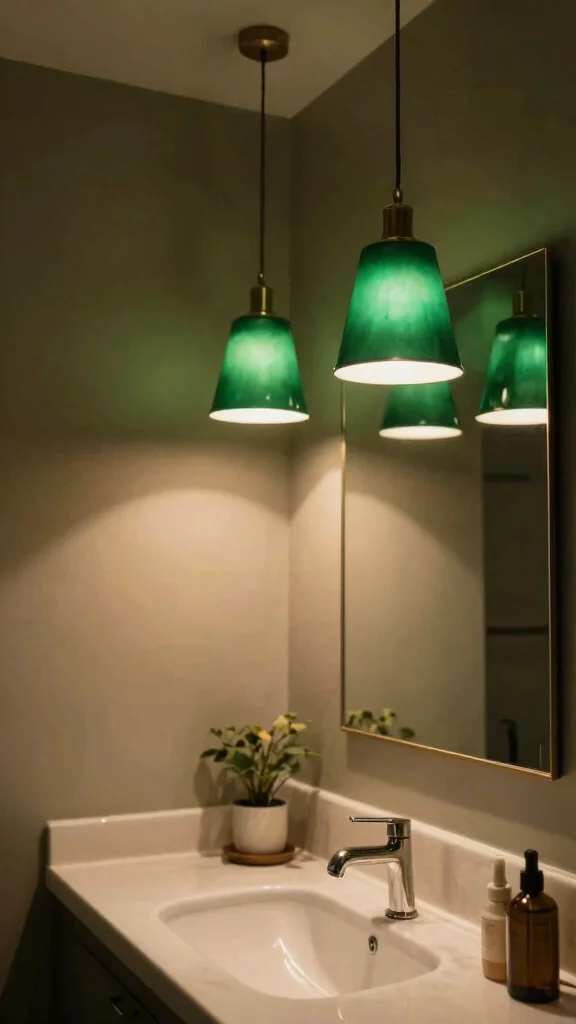 Lighting plays a crucial role in setting the mood, and emerald green fixtures can infuse your bathroom with elegance and uniqueness. Consider pendant lights or sconces in a deep green hue, or opt for fixtures with emerald glass that beautifully catches the light. This stunning color enhances decor while providing effective illumination, creating a warm and inviting atmosphere.
