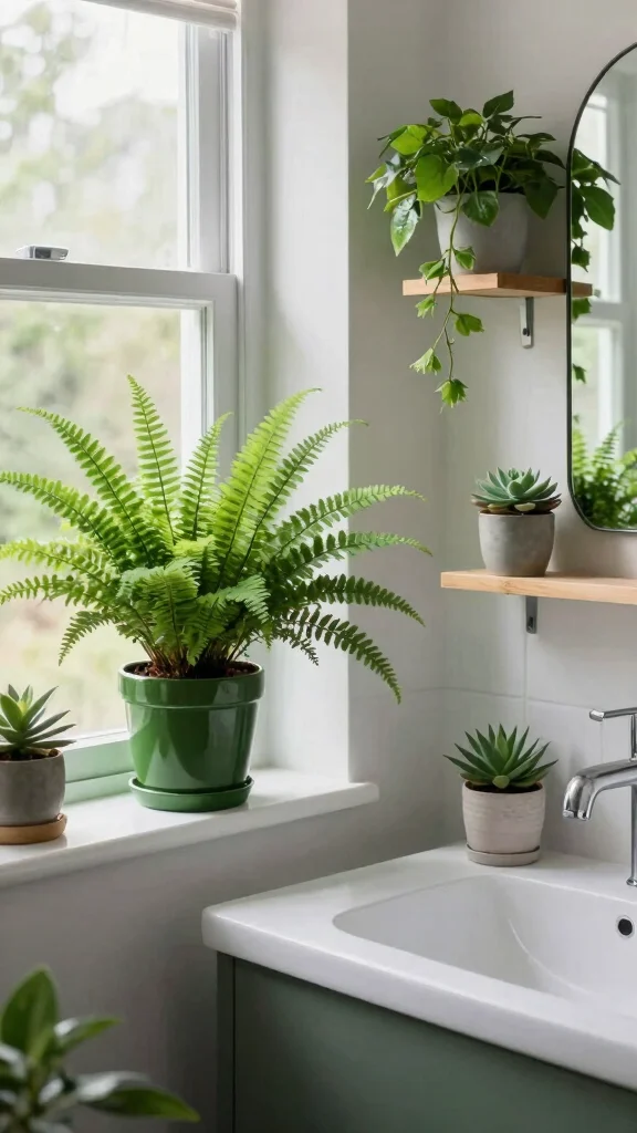 Elevate emerald green bathroom decor with low-maintenance plants like ferns and snake plants. Place them near a window or in emerald ceramic pots to boost humidity, then rotate occasionally to keep them thriving and your space spa-like.