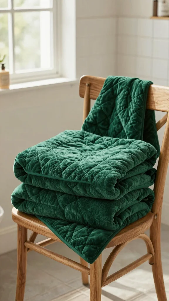 Adding emerald green quilts or throws can introduce comfort and warmth, making your bathroom feel more inviting. Drape them over a chair or neatly fold them on a shelf for a stylish, cozy look. Choose luxurious fabrics like velvet or soft cotton to achieve an upscale feel that enhances your decor.
