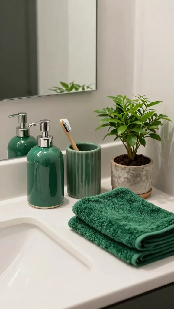 Accessorizing your bathroom with emerald green elements can effortlessly introduce this vibrant hue without overwhelming the space. Think about incorporating smaller items like soap dispensers, toothbrush holders, or towels in varying shades of green that pop against neutral backgrounds.