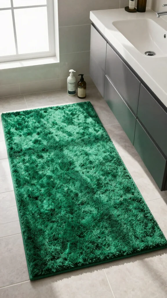 Incorporating an emerald green rug into your bathroom can add an inviting softness and warmth to the flooring. Select a plush rug for a cozy feel or a flatweave option for a more modern touch. A bold green rug can ground the room and tie the decor together, especially effective in smaller spaces.