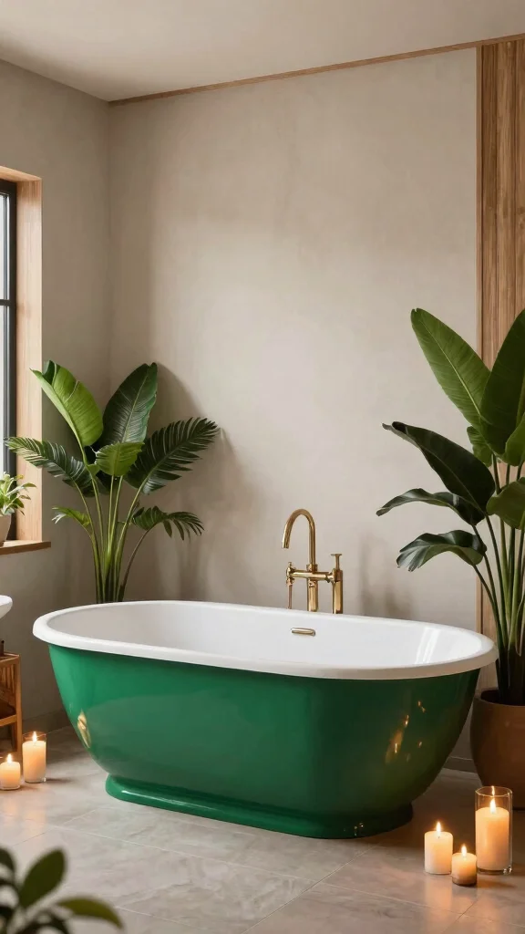 For an ultimate touch of luxury, consider an emerald green bathtub as the focal point in your bathroom design. A freestanding tub in this striking hue can create an eye-catching centerpiece that radiates opulence. Surround the tub with natural stone tiles or wooden accents that beautifully contrast with the green, enhancing its visual appeal.