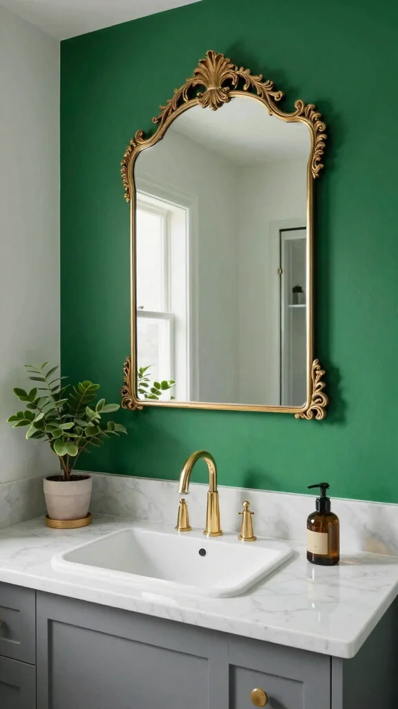 Incorporate emerald green mirrors to add depth and luxury, making your bathroom feel more spacious and elegant.