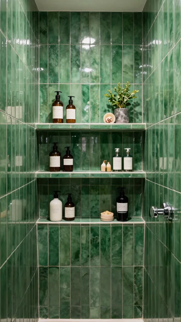 Create an elegant shower nook using emerald green tiles or accents. This feature can showcase the rich color while providing practical storage for shower essentials. By combining functionality with style, you can elevate your bathroom’s design.