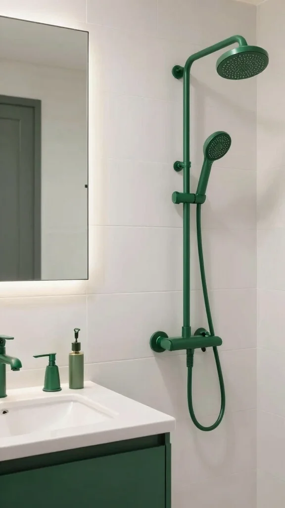 Replace standard fixtures with emerald green options for a standout modern touch in your bathroom. Sink faucets, showerheads, and cabinet handles in this bold hue create a striking contrast against white or neutral backgrounds, making a memorable impact.