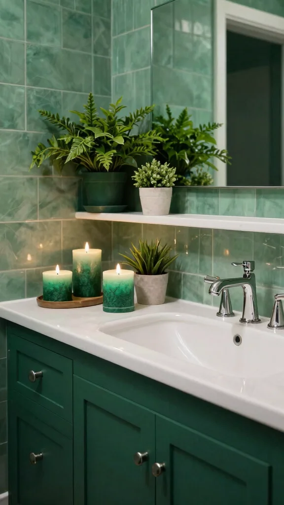 To enhance the design, consider a contrasting countertop, like white marble or dark granite, to provide visual interest. Installing under-cabinet lighting will create a warm glow that highlights the emerald hue, while open shelving can stylishly display your bathroom essentials.