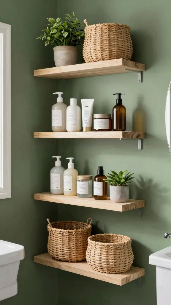 A clutter-free bathroom is essential for maintaining a cozy atmosphere. Use stylish storage solutions like floating shelves or cabinetry that harmonize with your forest green theme. Woven baskets or natural wood containers keep essentials organized while contributing to the earthy aesthetic.