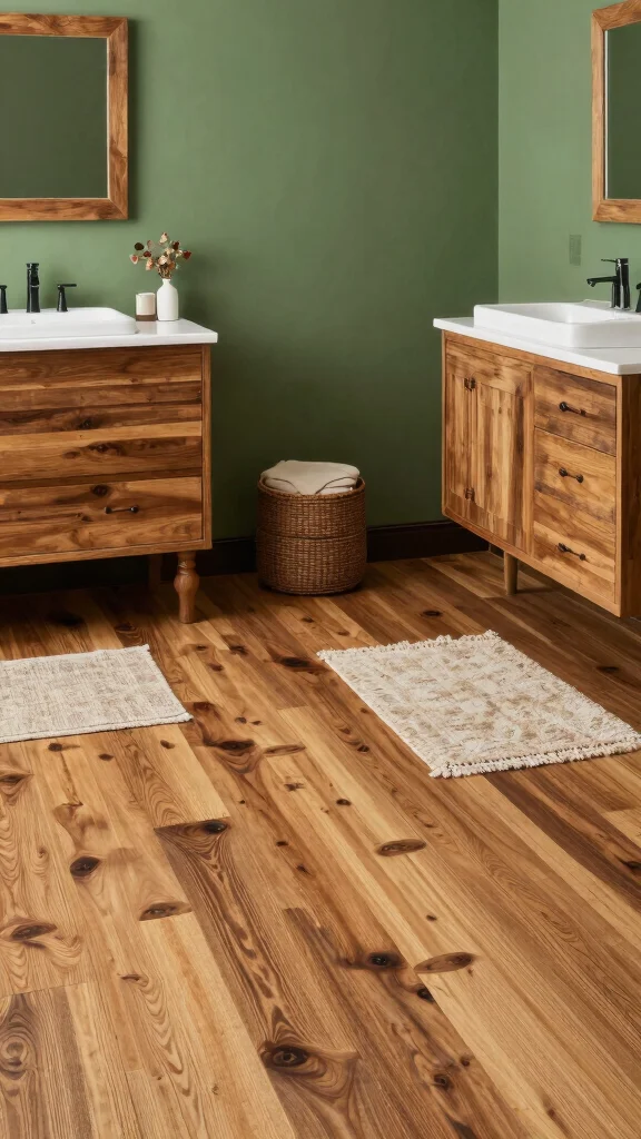 The flooring you choose plays a vital role in your bathroom’s overall feel. Consider sustainable options like bamboo, cork, or reclaimed wood that align perfectly with your forest green decor. These materials are eco-friendly and add warmth to the space.