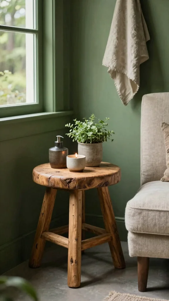 If space allows, adding a small seating area can enhance the luxurious feel of your bathroom. Consider a rustic stool or a plush chair in a neutral tone that complements the forest green. This area can serve as a relaxing spot or a place to display decorative items.