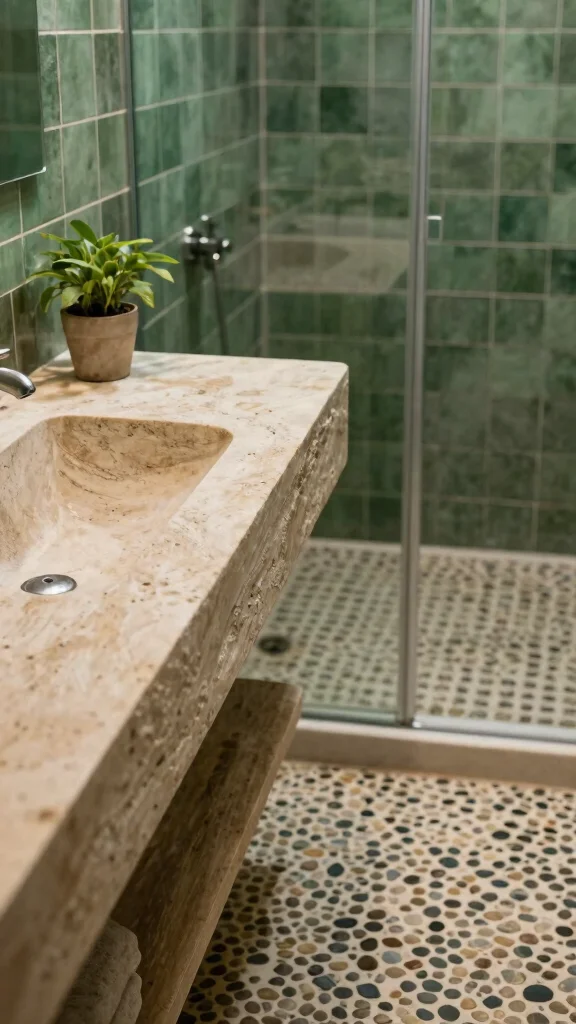 Look for eco-friendly stones like granite or reclaimed wood to maintain your commitment to sustainability. The textures and colors of natural stone harmonize perfectly with deep green hues, creating a serene atmosphere.