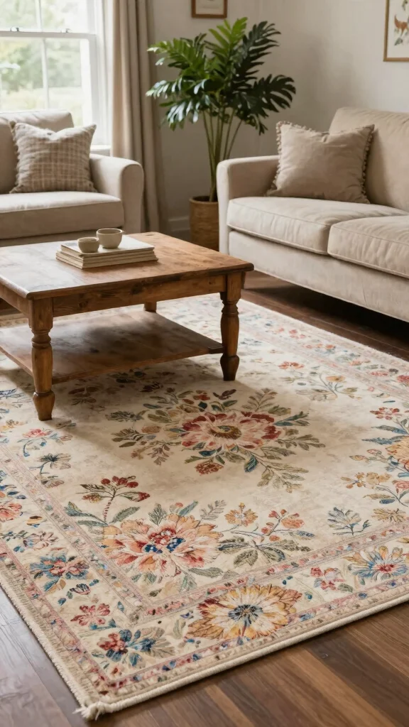 To make the most of this aesthetic, consider placing a vibrant floral rug against neutral furnishings to allow its colors to pop. Alternatively, layer it within a wooden setting to enhance that cozy, rustic appeal.
