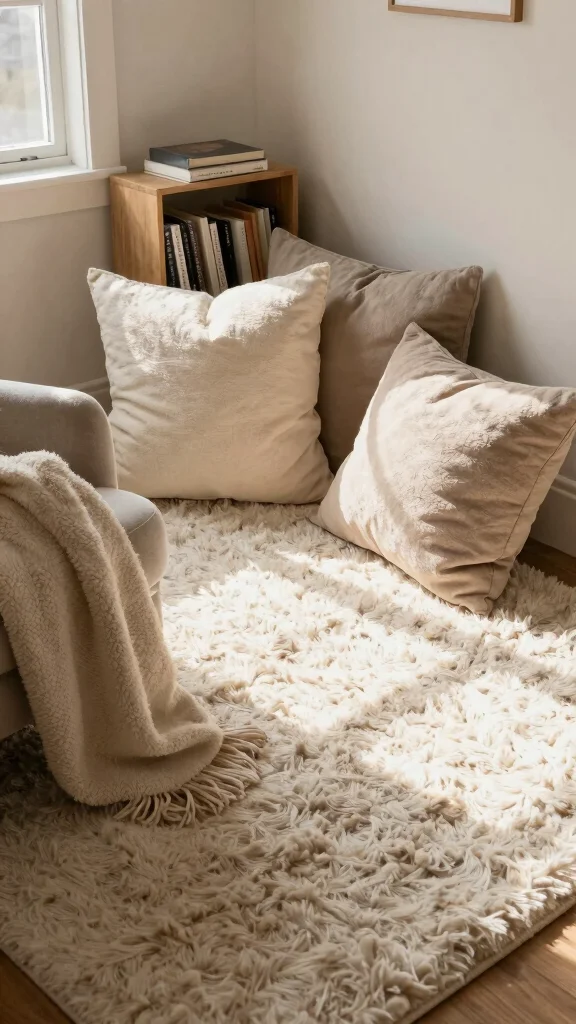 For the ultimate cozy corner, consider placing a shag rug in front of a fireplace and pairing it with plush cushions and throws.