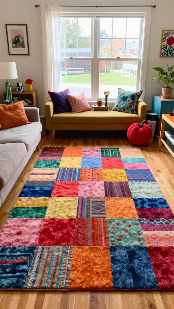 A colorful patchwork area rug can become the vibrant centerpiece of your room. This style combines various colors and patterns, instantly adding a playful touch to your rustic decor. Placing a patchwork rug in family or children’s rooms creates a welcoming and fun environment, while its versatility allows it to fit in with diverse decor styles.