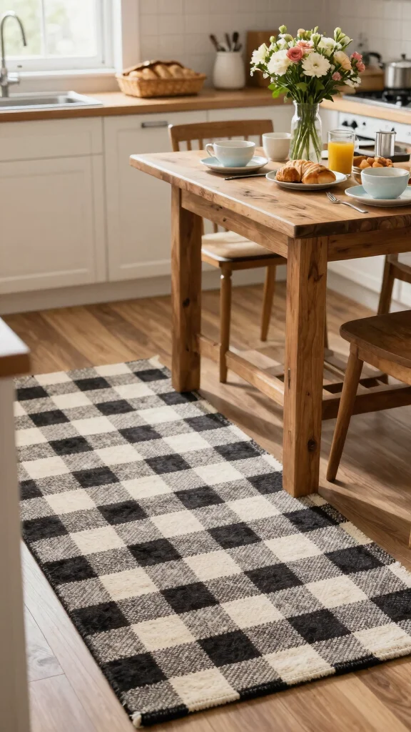 Classic checks bring instant charm to kitchens and dining rooms, especially in gray and white, and pair beautifully with French country area rugs. A checkered rug under the table ties your cozy, vintage look together in minutes—practical, timeless, and instantly inviting.