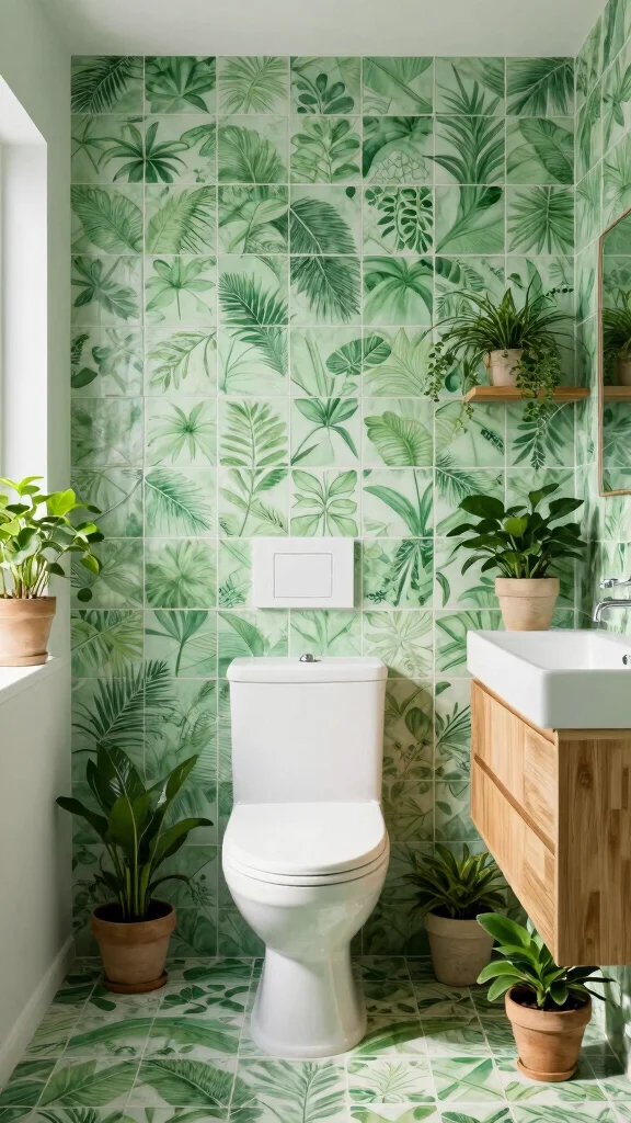 Pair patterned tiles with simple, solid-colored fixtures to allow them to shine. Incorporating natural wood elements and plenty of greenery will enhance the nature-inspired theme, making your bathroom feel like a mini oasis. Choosing leafy designs promotes a calming and relaxing atmosphere that’s perfect for unwinding.